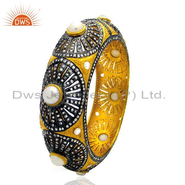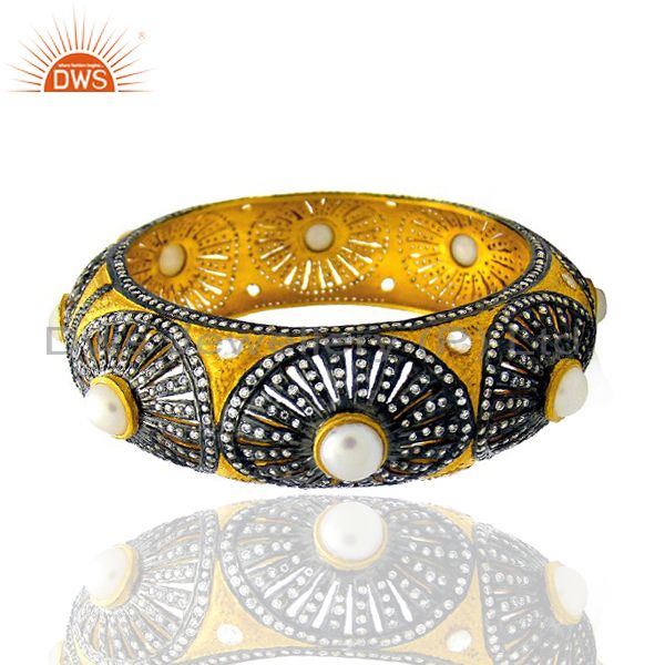22K Yellow Gold Plated Brass Cz And Pearl Designer Wide Cuff Bracelet