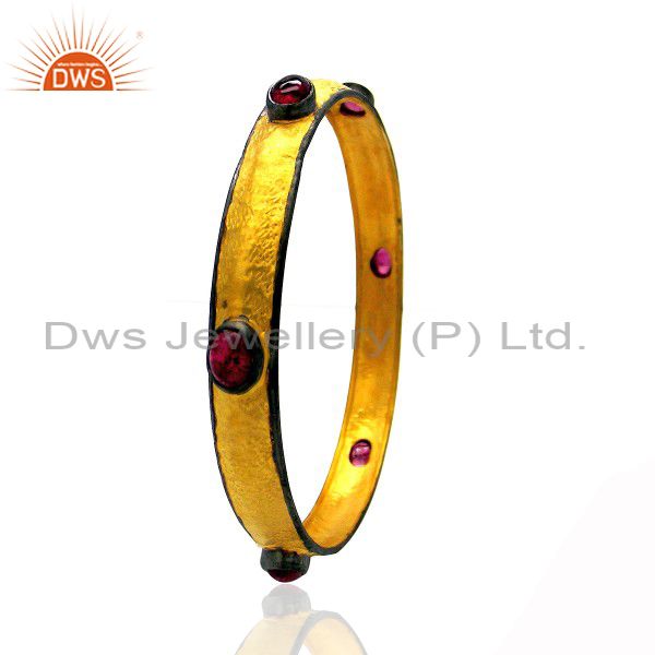 22K Yellow Gold Plated Sterling Silver Pink Tourmaline Gemstone Bangle Bracelet