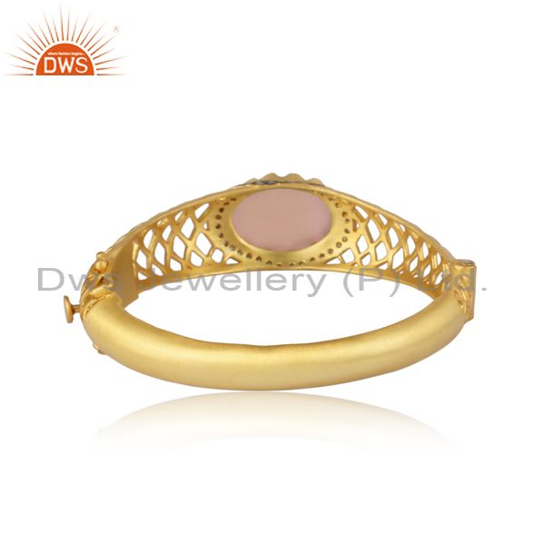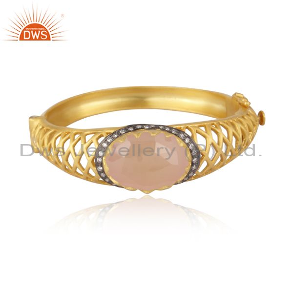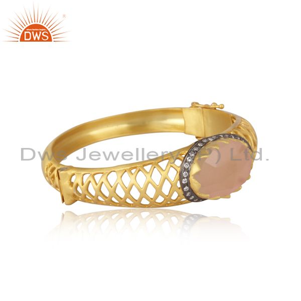 CZ And Rose Chalcedony Set Textured Brass Gold Openable Bangle