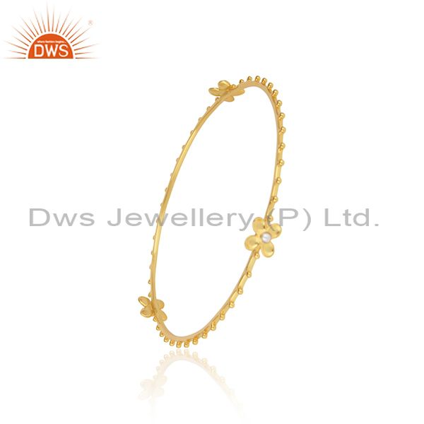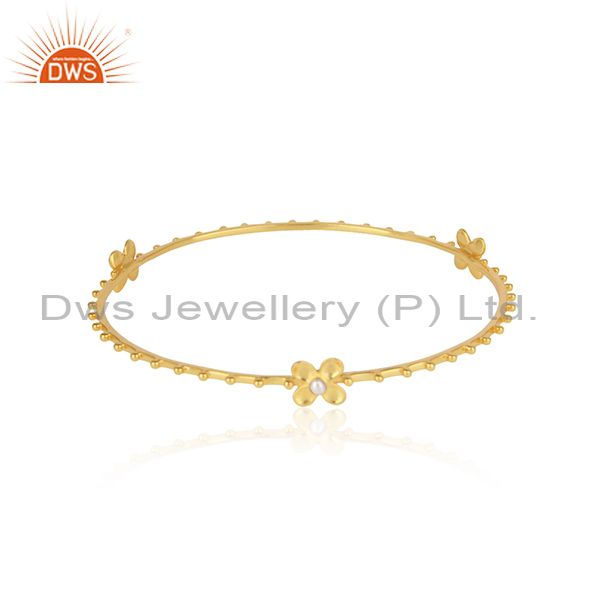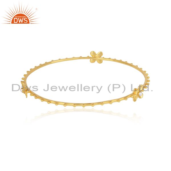 Designer Floral Silver Bangle With 18K Yellow Gold On And Pearl