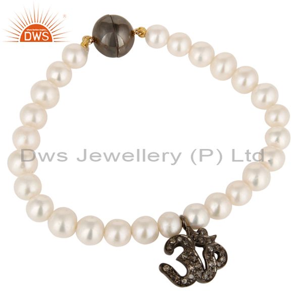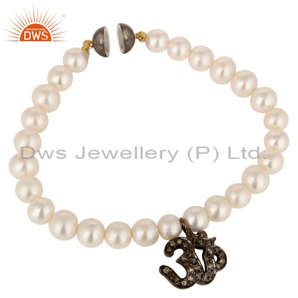 14K Solid Yellow Gold Natural Pearl Bracelet With Pave Diamond Om Charm