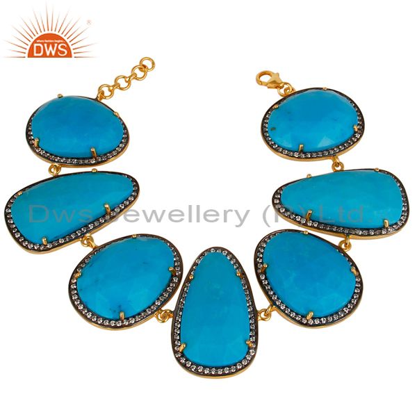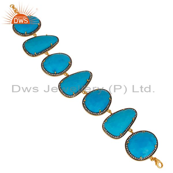 14K Yellow Gold Plated 925 Sterling Silver Turquoise & White Zirconia Bracelet