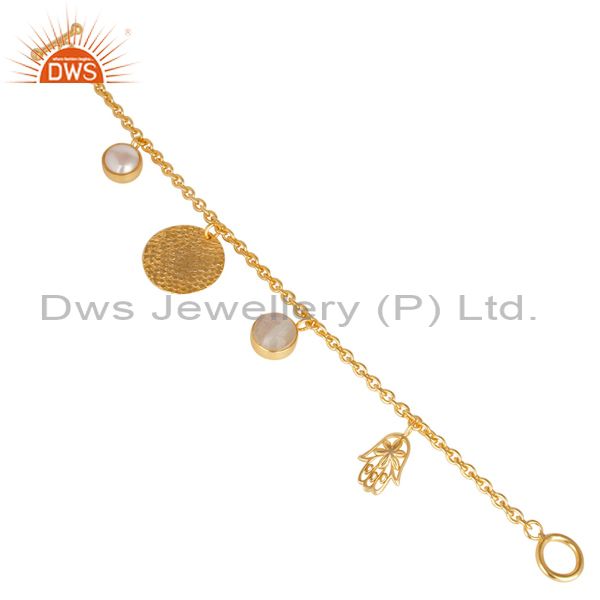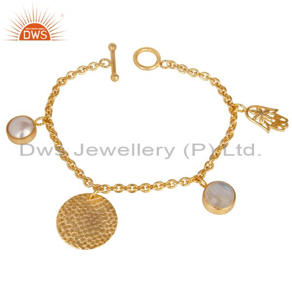 14K Yellow Gold Plated Handmade Rainbow Moonstone & Pearl Chain Brass Bracelet