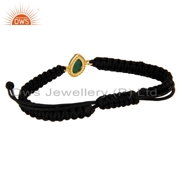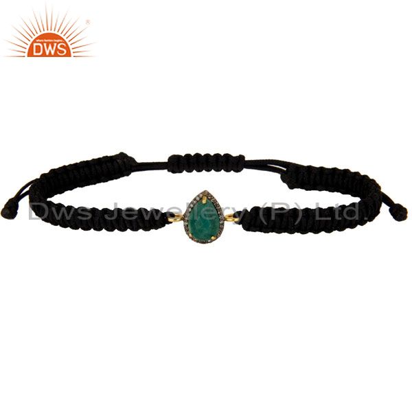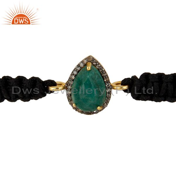 18K Gold Sterling Silver Pave Diamond And Emerald Black Cord Macrame Bracelet
