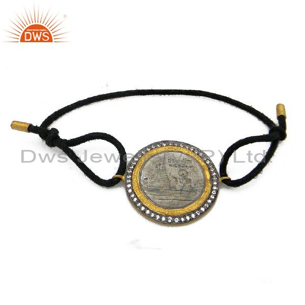 24K Gold Plated And Oxidized Sterling Silver Cz Vintage Coin Black Cord Bracelet