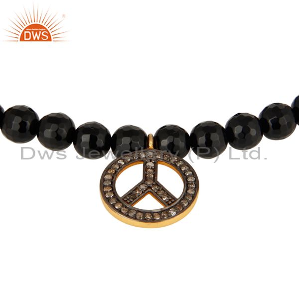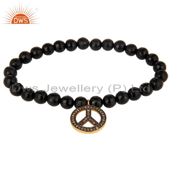 6Mm Faceted Black Onyx Beads Stretch Bracelet With Pave Diamond Peace Sign Charm