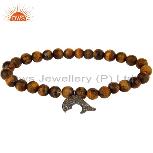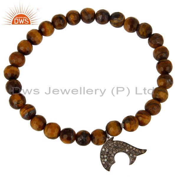 925 Sterling Silver Diamond Accent Dolphin Charms Tiger Eye Stretch Bracelet