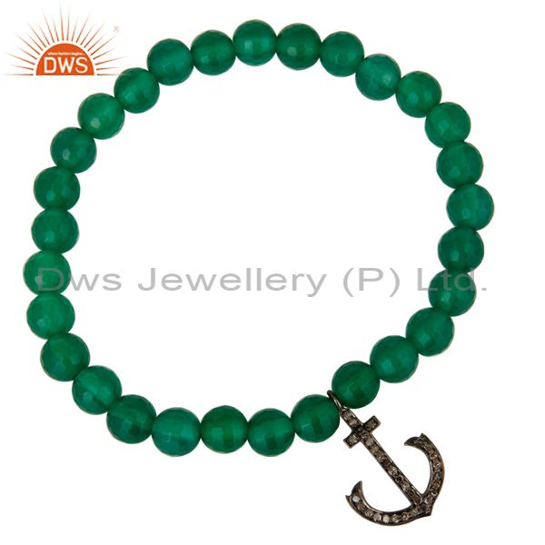 925 Sterling Silver Pave Diamond Anchor Charms Green Onyx Beads Stretch Bracelet