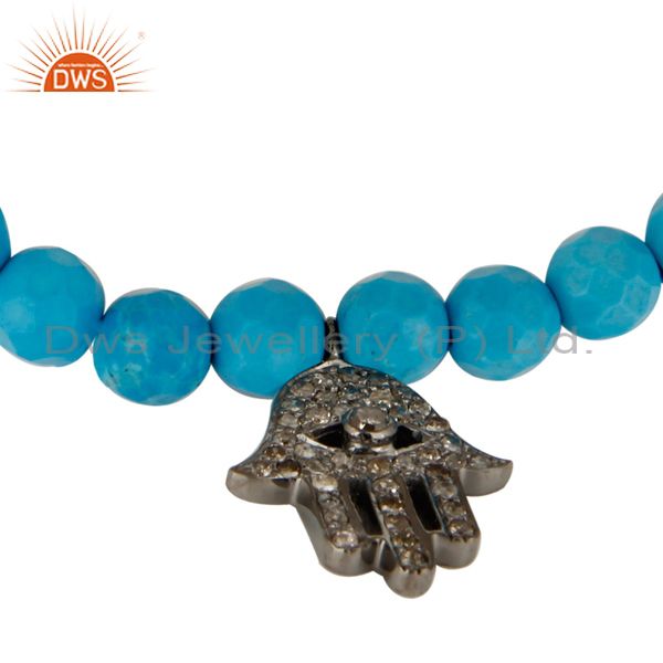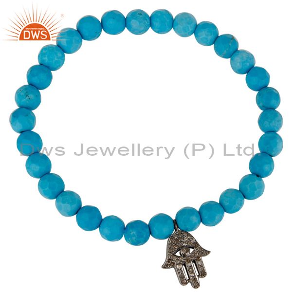 925 Sterling Silver Turquoise Pave Diamond Hamsa Charms Stretch Bracelet