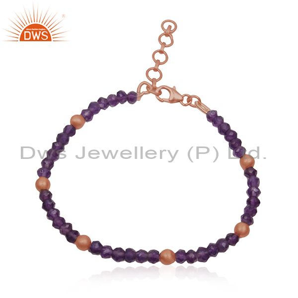 Beaded Amethyst Gemstone Rose Gold Plated 925 Silver Strand Bracelet Wholesale