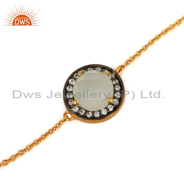 Blue Chalcedony Gemstone 18K Gold Plated Sterling Silver Chain Bracelet With Cz