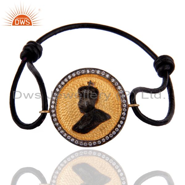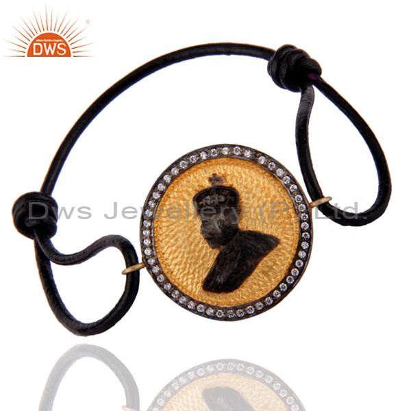 Brass Gold Bracelet With Leather Dori, Cubic Zirconia Stone