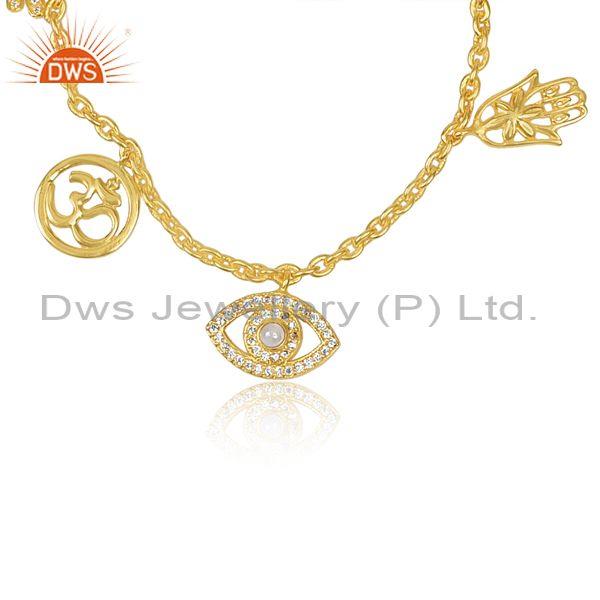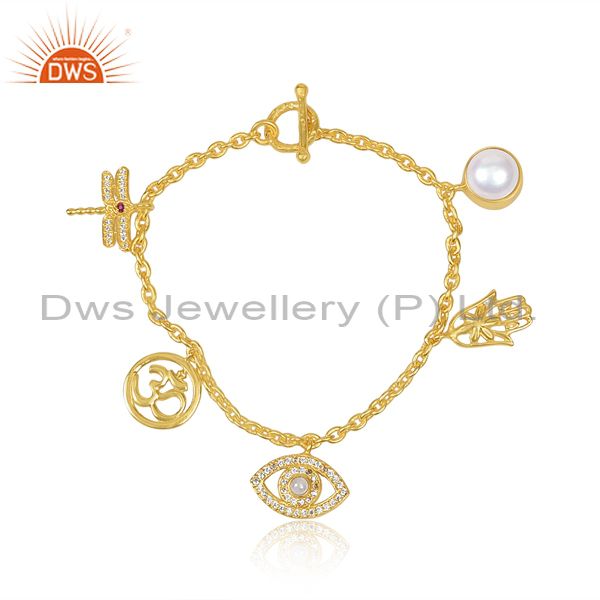 Cz, Ruby, Rainbow Moon Stone, Pearl Set Brass Gold Bracelet