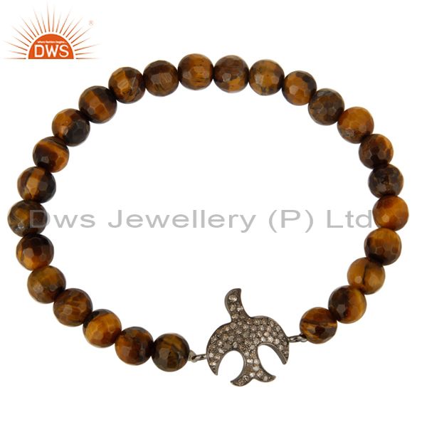 Faceted Tiger Eye Stretch Bracelet With Pave Set Diamond Flying Bird Charms