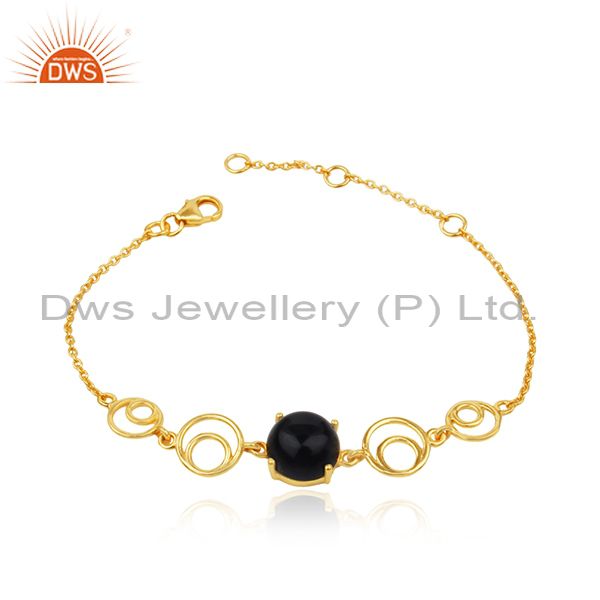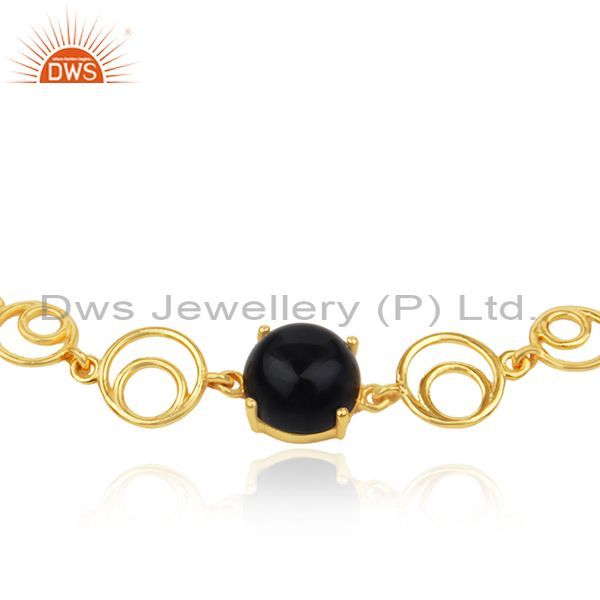 Genuine Black Onyx Gemstone Sterling Silver Gold Plated Chain Bracelet