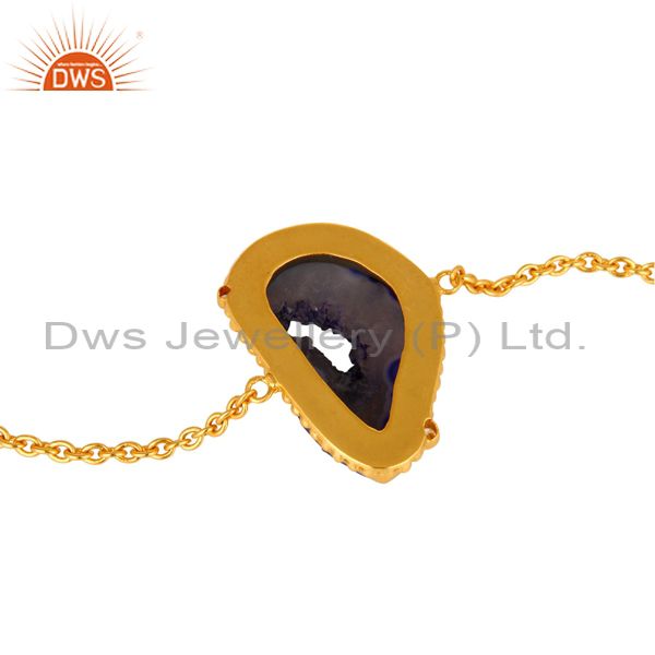 Handcrafted Blue Druzy Agate Slice Geode Yellow Gold Plated Chain Bracelet