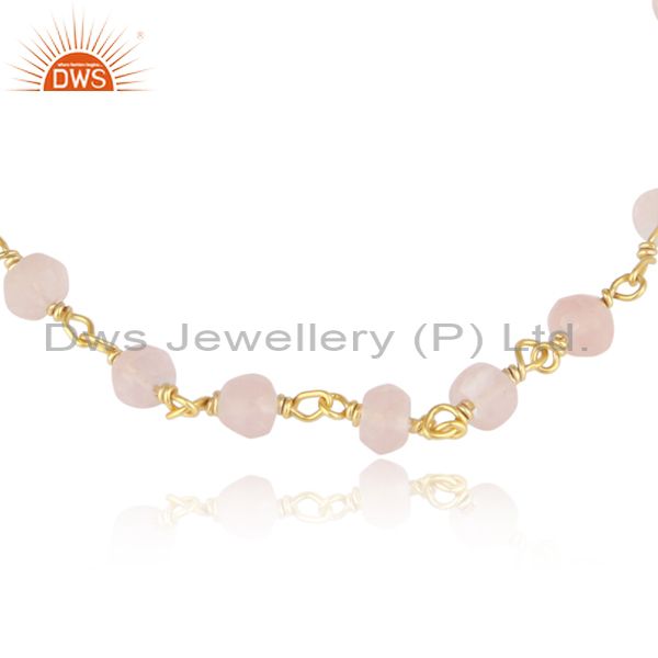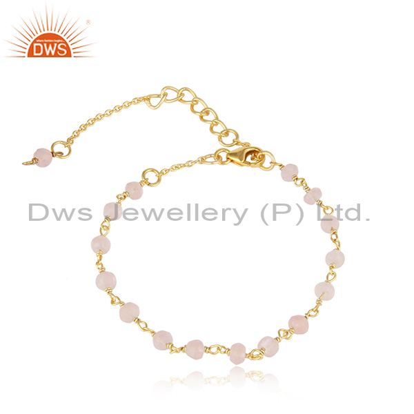 Handcrafted Rose Quartz Bead Bracelet In Yellow Gold On Silver