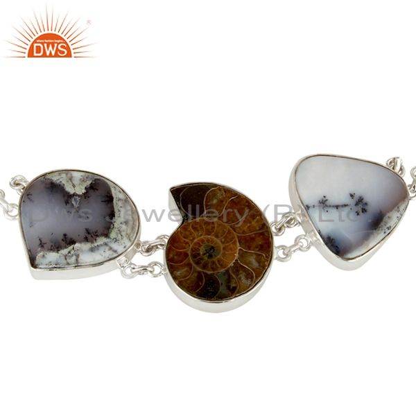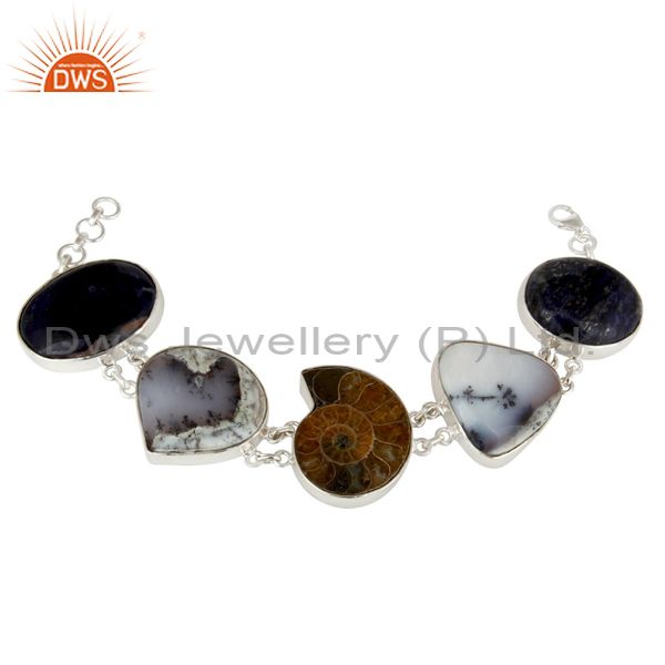 Natural Ammonite, Lapis Lazuli And Dendritic Opal Sterling Silver Bracelet