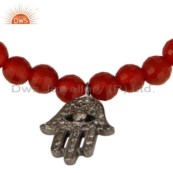 Natural Carnelian Sterling Silver Pave Diamond Hamsa Charms Stretch Bracelet