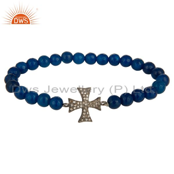 Pave Diamond 925 Sterling Silver Cross Charms Bracelet With Blue Onyx Beads