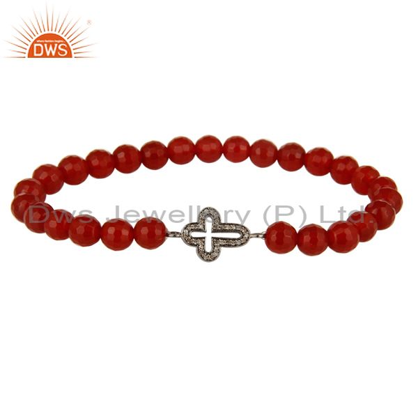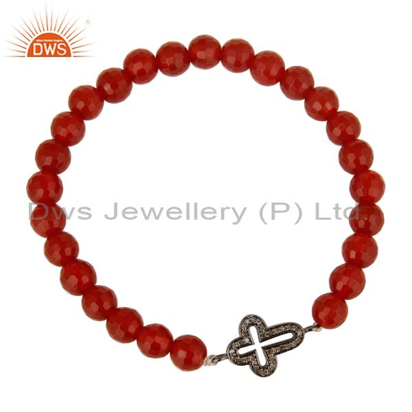 Pave Set Diamond 925 Silver Cross Charm Carnelian Beaded Adjustable Bracelet
