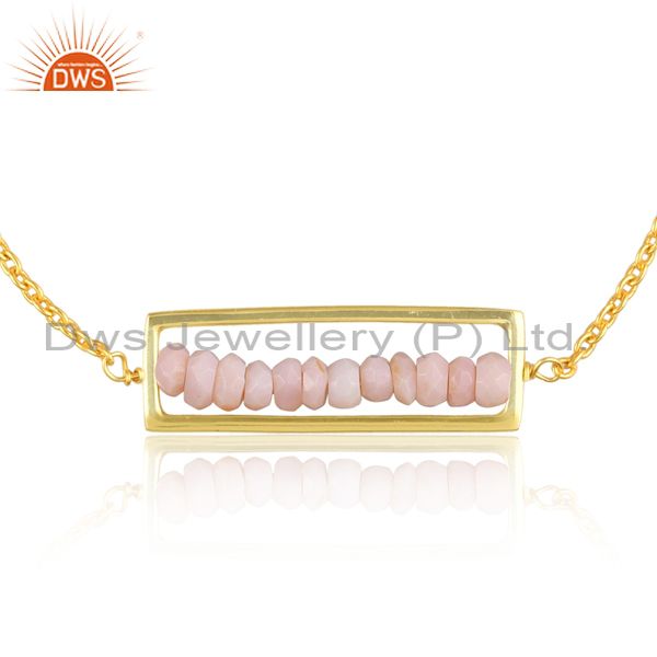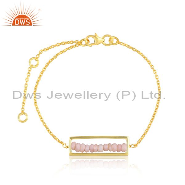 Pink Opal Rectangle Charm Set Gold On Silver Chain Bracelet