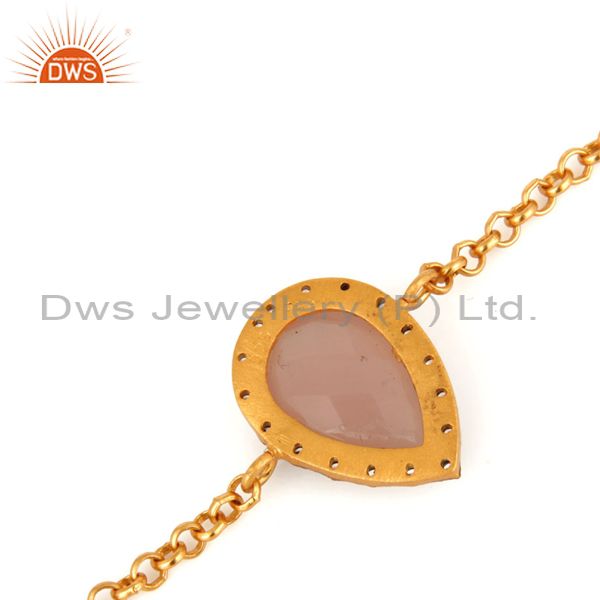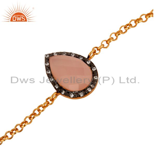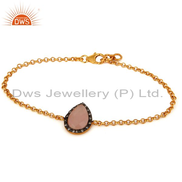 Rose Chalcedony Gemstone & Cz 18K Gold Plated 925 Sterling Silver Chain Bracelet