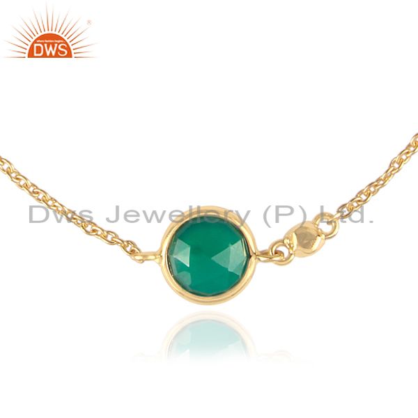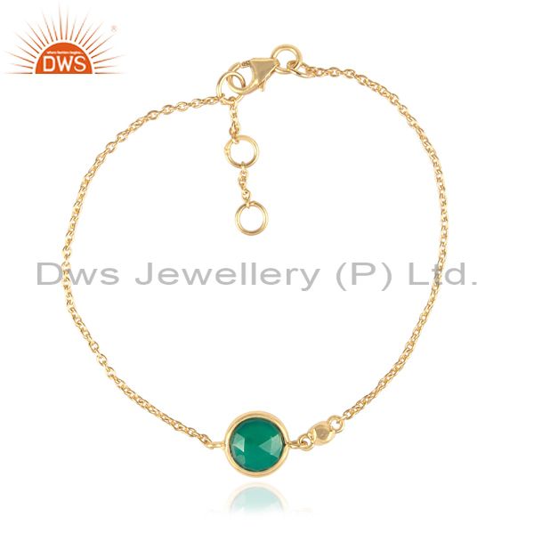 Round Green Onyx Charm Set Gold On 925 Silver Chain Bracelet