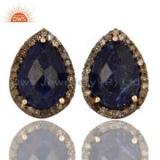 14K Solid Yellow Gold Blue Sapphire And Pave Diamond Stackable Open Bangle