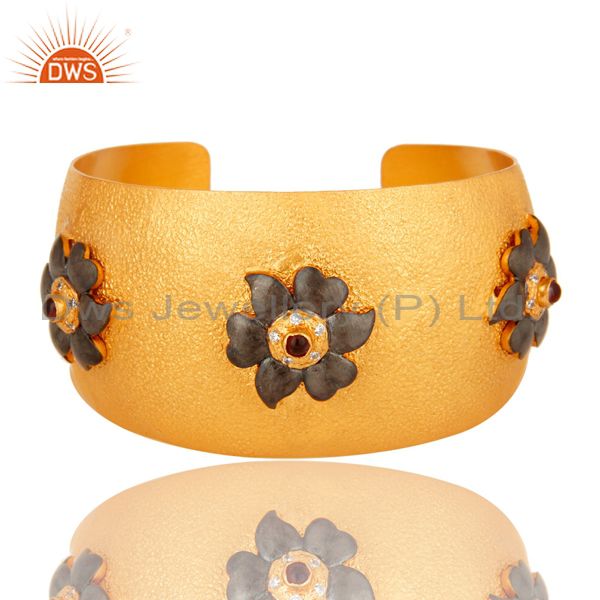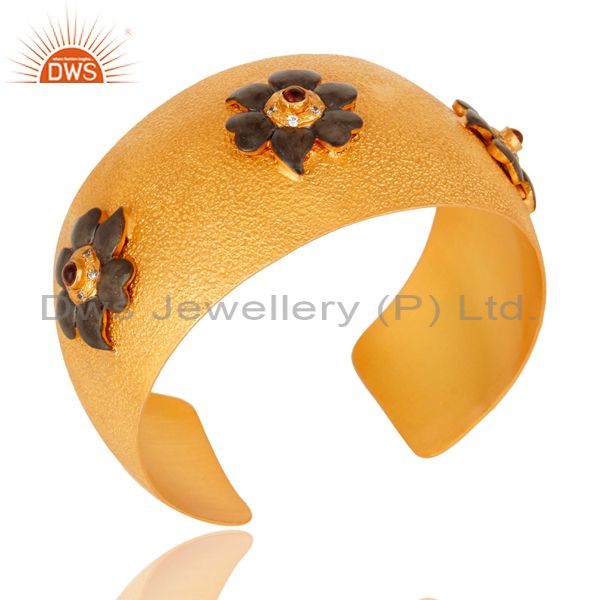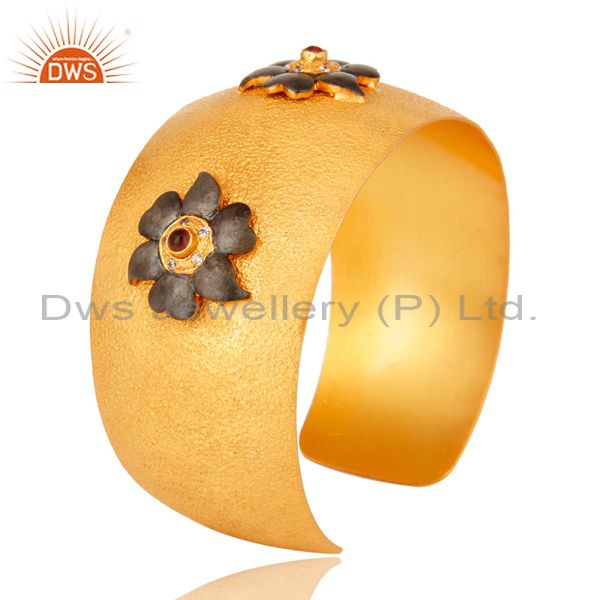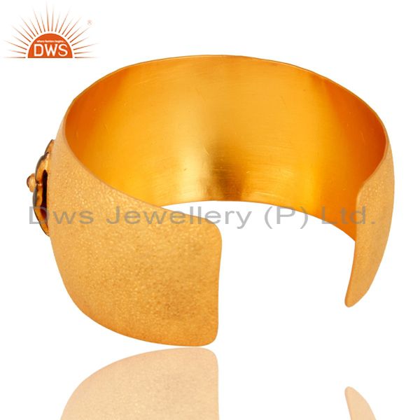 18K Yellow Gold Over Brass Matte Finish Hammered Cuff Bracelet With Pink Glass &