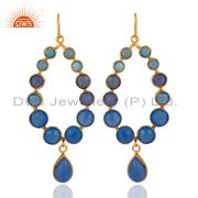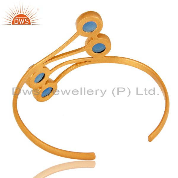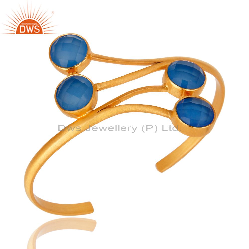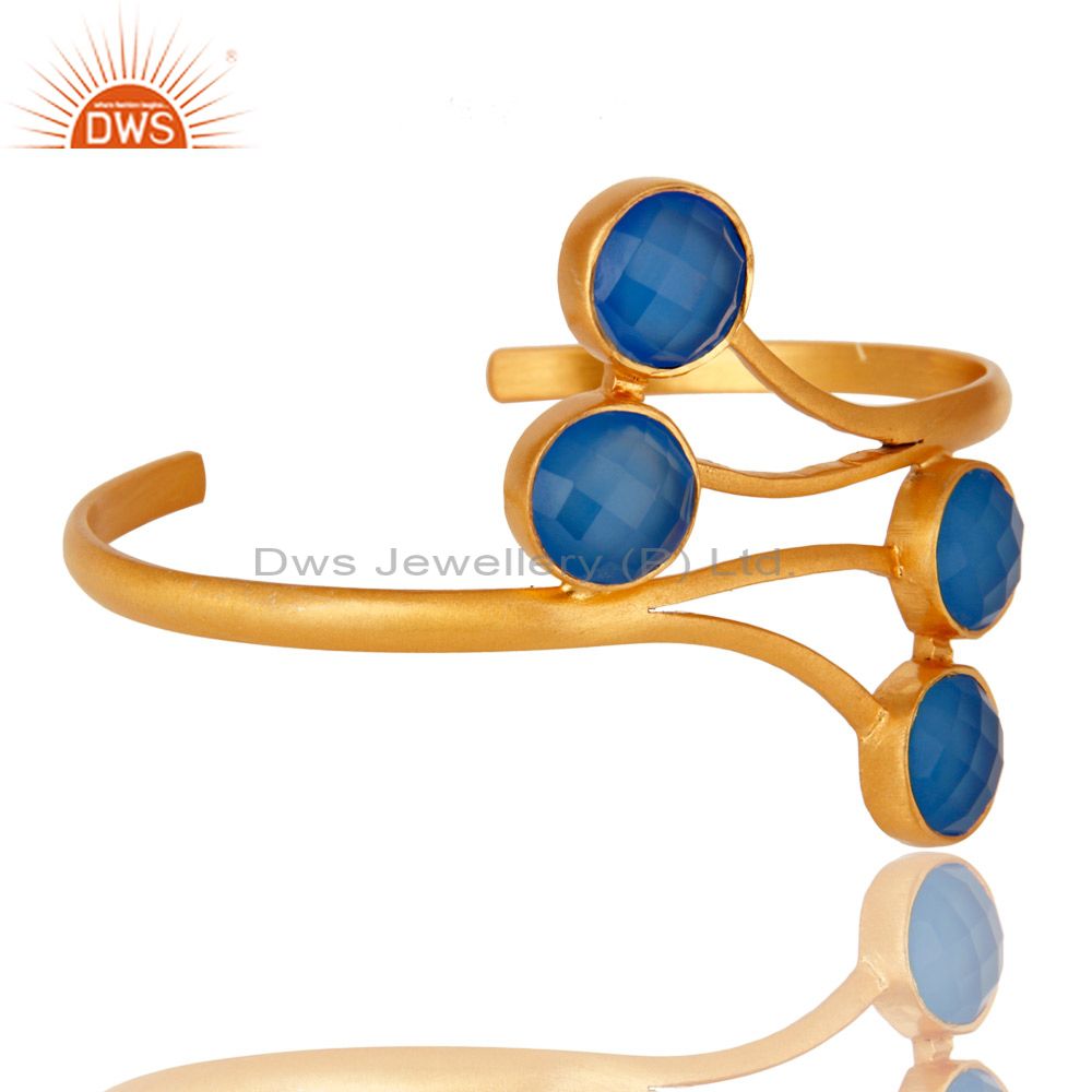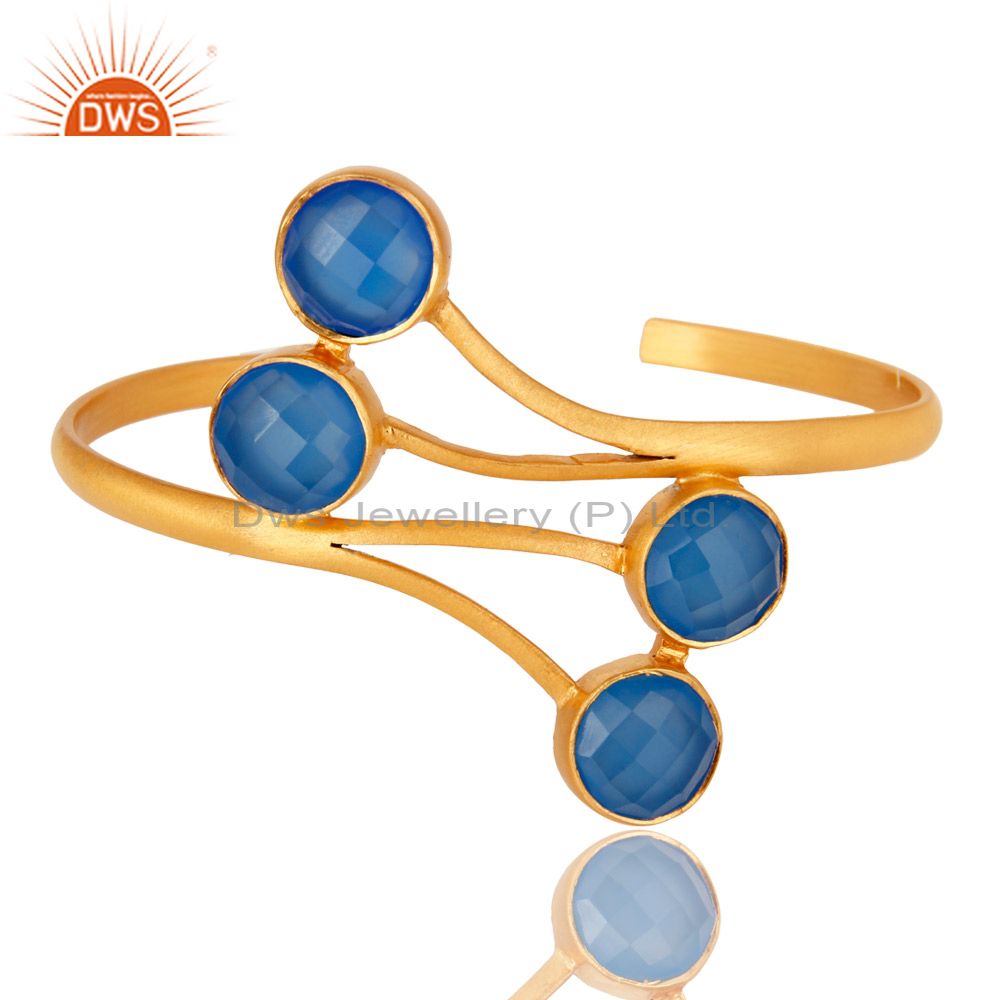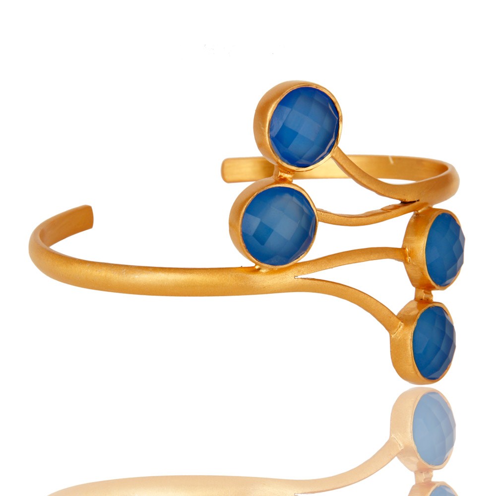 18K Yellow Gold Plated Aqua Blue Chalcedony Handmade Cuff Bracelet / Bangle