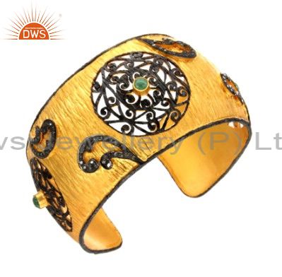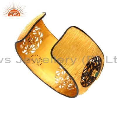 22K Gold Over Sterling Silver Pave Diamond And Emerald Dome Cuff Bracelet