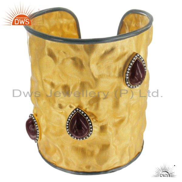 22K Yellow Gold Over Sterling Silver Ruby And Pave Diamond Wide Cuff Bracelet