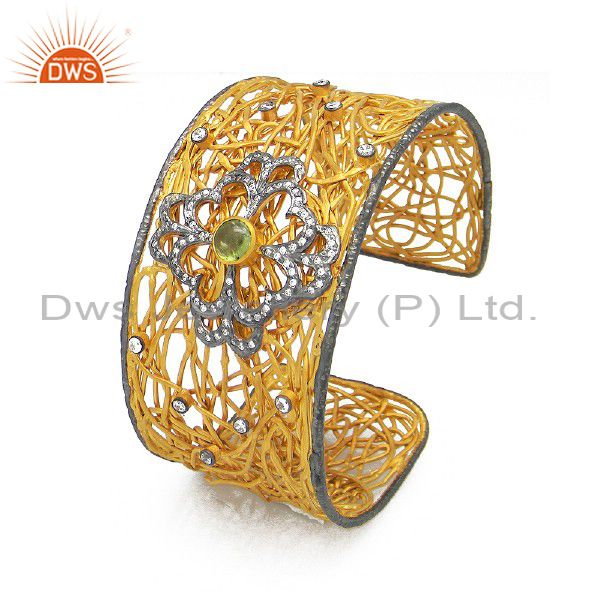 22K Yellow Gold Plated Brass Green Onyx And Cz Wire Woven Wide Cuff Bangle