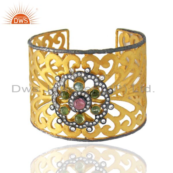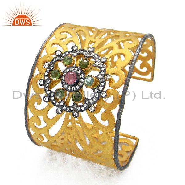 22K Yellow Gold Plated Brass Green Tourmaline And Cz Filigree Wide Cuff Bangle