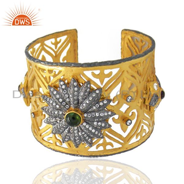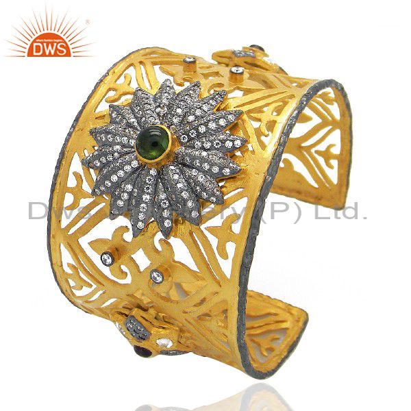 22K Yellow Gold Plated Brass Green Tourmaline And Cz Filigree Wide Cuff Bracelet
