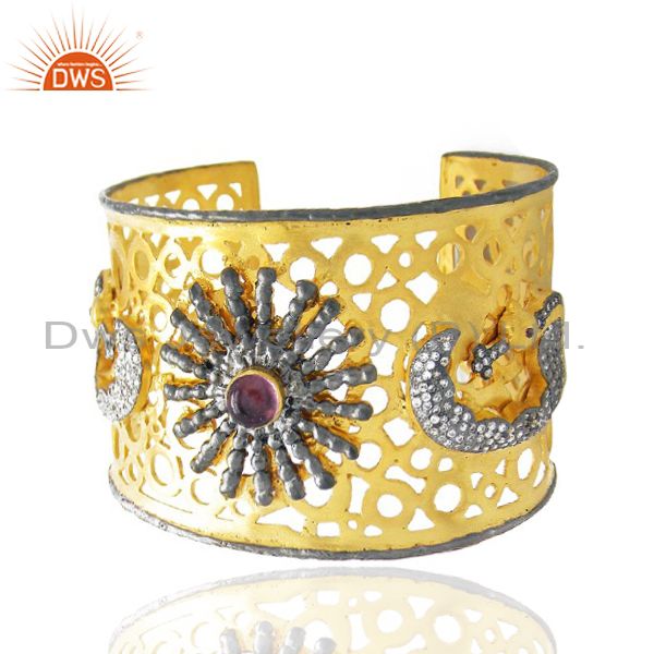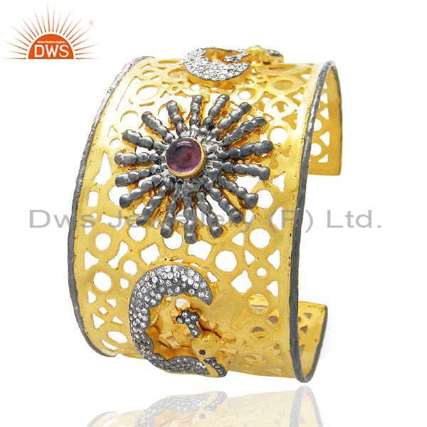 22K Yellow Gold Plated Brass Pink Glass And Cz Filigree Peacock Cuff Bracelet