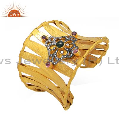 22K Yellow Gold Plated Brass Pink Tourmaline And Cz Designer Wide Cuff Bangle