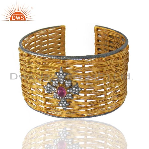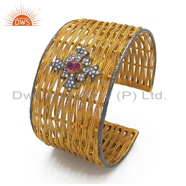 22K Yellow Gold Plated Brass Pink Tourmaline And Cz Woven Wide Cuff Bangle