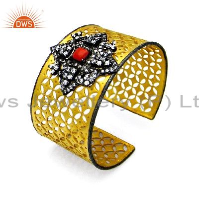 22K Yellow Gold Plated Sterling Silver Coral & Cz Star Filigree Cuff Bracelet