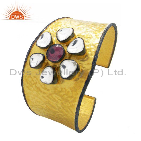 22K Yellow Gold Plated Sterling Silver Crystal Polki And Rhodonite Cuff Bracelet