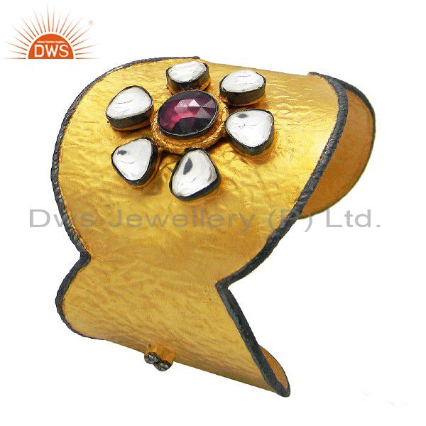 22K Yellow Gold Plated Sterling Silver Cz Polki And Rhodonite Wide Cuff Bracelet