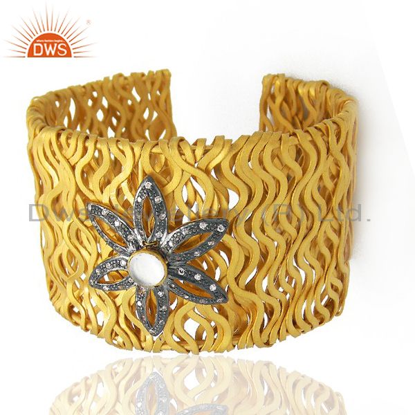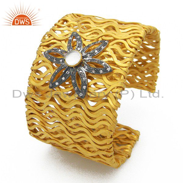 22K Yellow Gold Plated Sterling Silver Cz Vintage Look Wide Cuff Bracelet