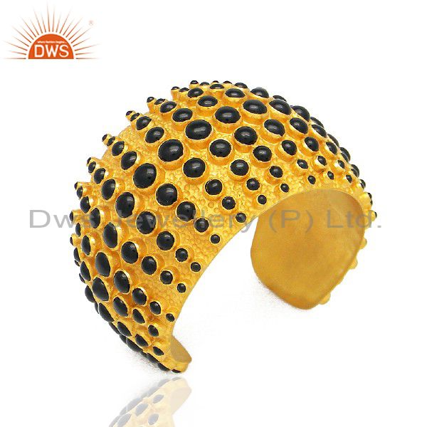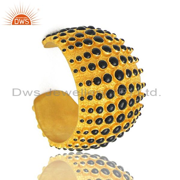 24K Yellow Gold Plated Brass Black Onyx Gemstone Cuff Bracelet Wide Bangle