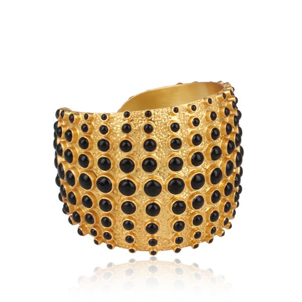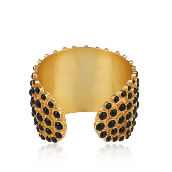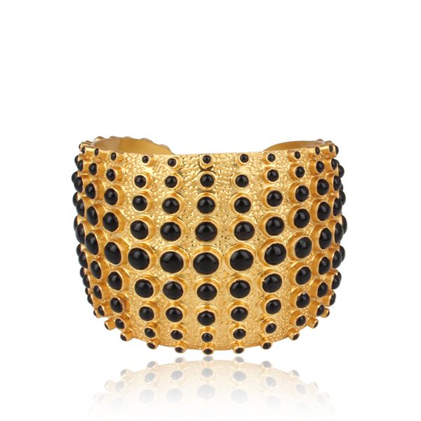 24K Yellow Gold Plated Sterling Silver Black Onyx Cuff Bracelet Wide Bangle