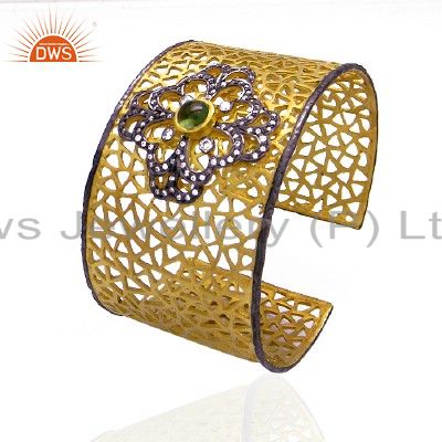 24K Yellow Gold Plated Sterling Silver Tourmaline & Cz Filigree Cuff Bracelet