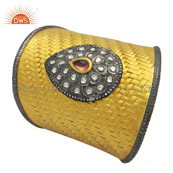24K Yellow Gold Plated Sterling Silver Tourmaline And Cz Polki Cuff Bracelet