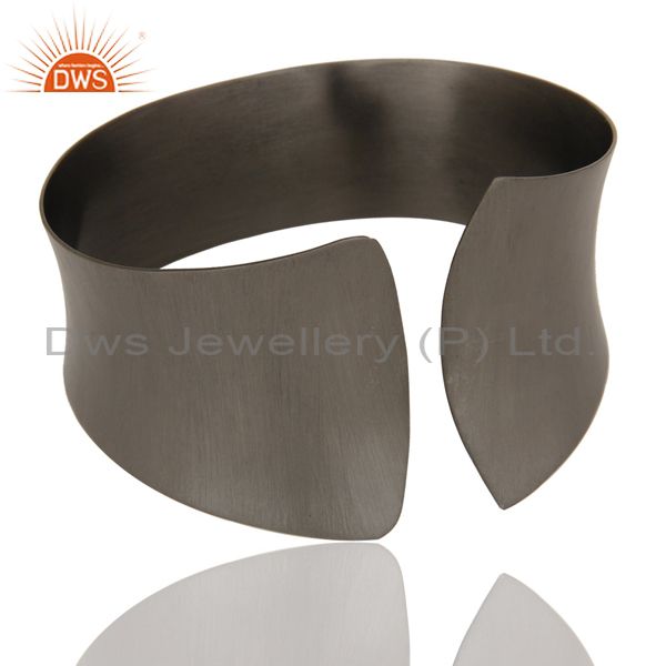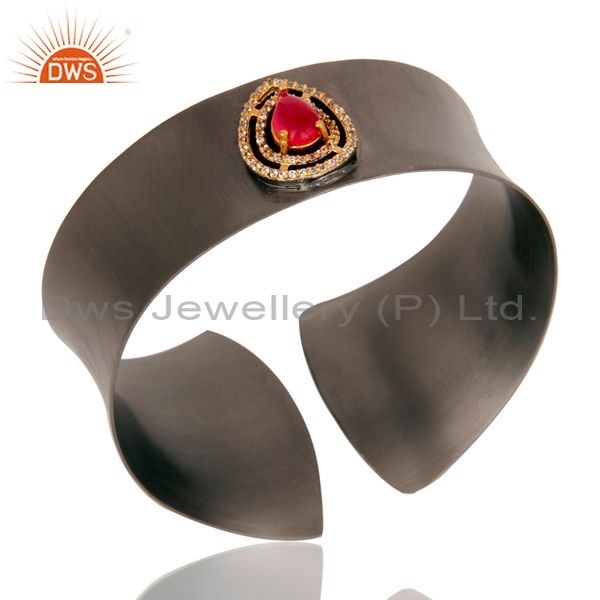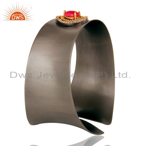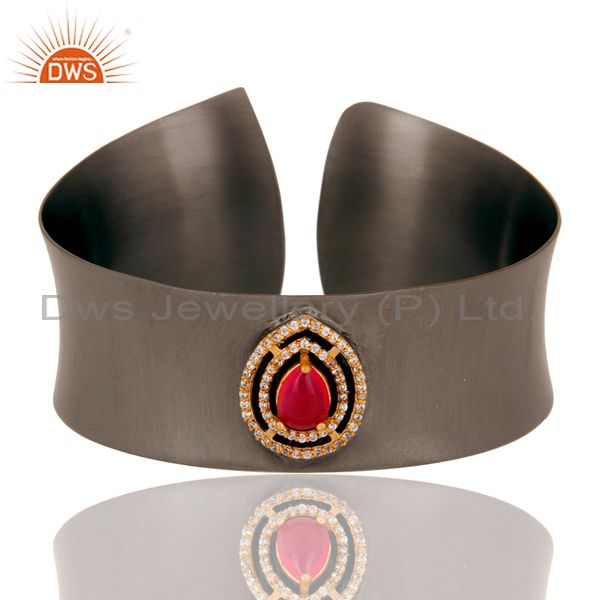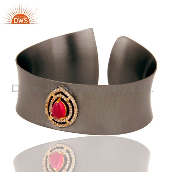Black Oxidized Comfort Fit Wide Cuff Made With Pink Chalcedony and Zircon