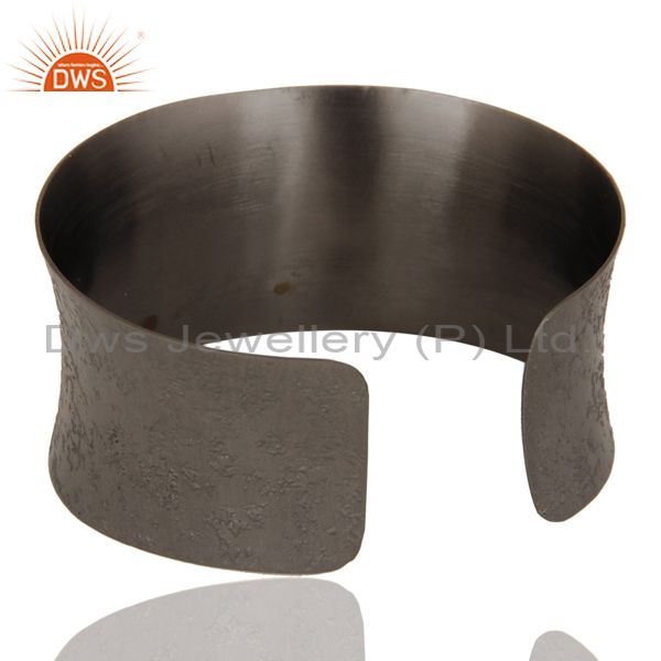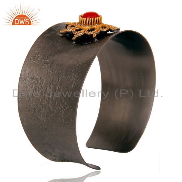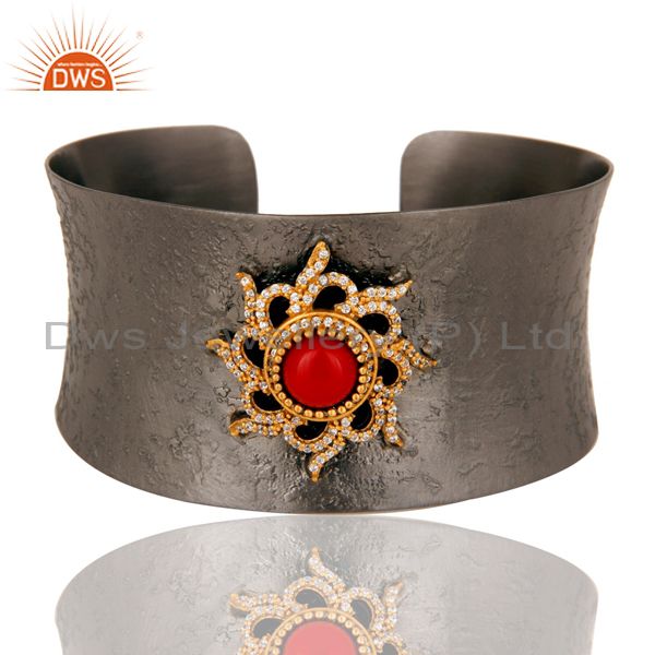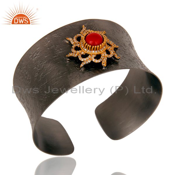 Black Oxidized Comfort Fit Wide Cuff Unique Bangle with Coral and Zircon