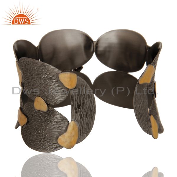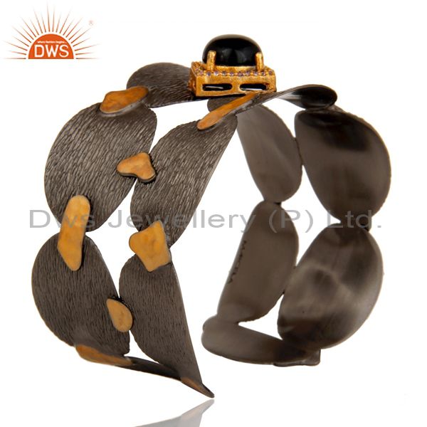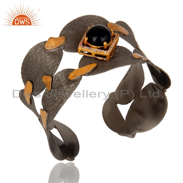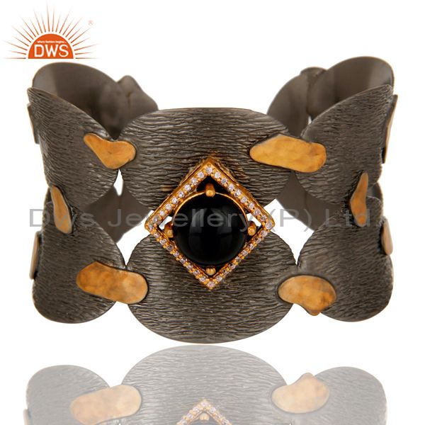 Black Oxidized Wide Cuff Unique Brass Bangle With Onyx And Zircon